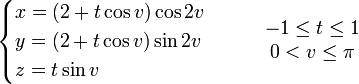 Je vais prendre comme exemple le ruban de Möbius. C'est un objet mathématique très simple mais que j'aime beaucoup, sa principale caractéristique étant d'être la seule surface “complexe” n'ayant… qu'un seul côté ! Suivez mentalement sa face, vous parcourez toute la surface de l'objet. Un petit tour sur Wikipedia m'a indiqué sa formule. Cette dernière donne trois équations correspondant aux coordonnées x, y et z de tous les points de la surface :